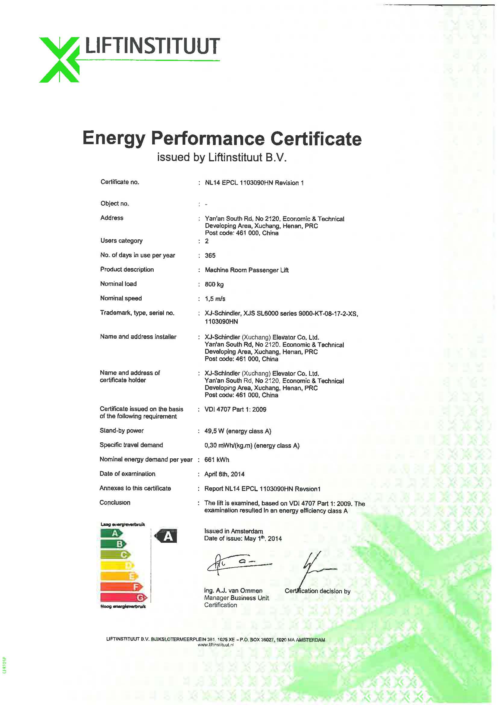 日前,公司順利通過了荷蘭LIFTINSTITUUT節(jié)能認證機構(gòu)的審核,被國際VDI評為最高等級A級節(jié)能電梯證書。