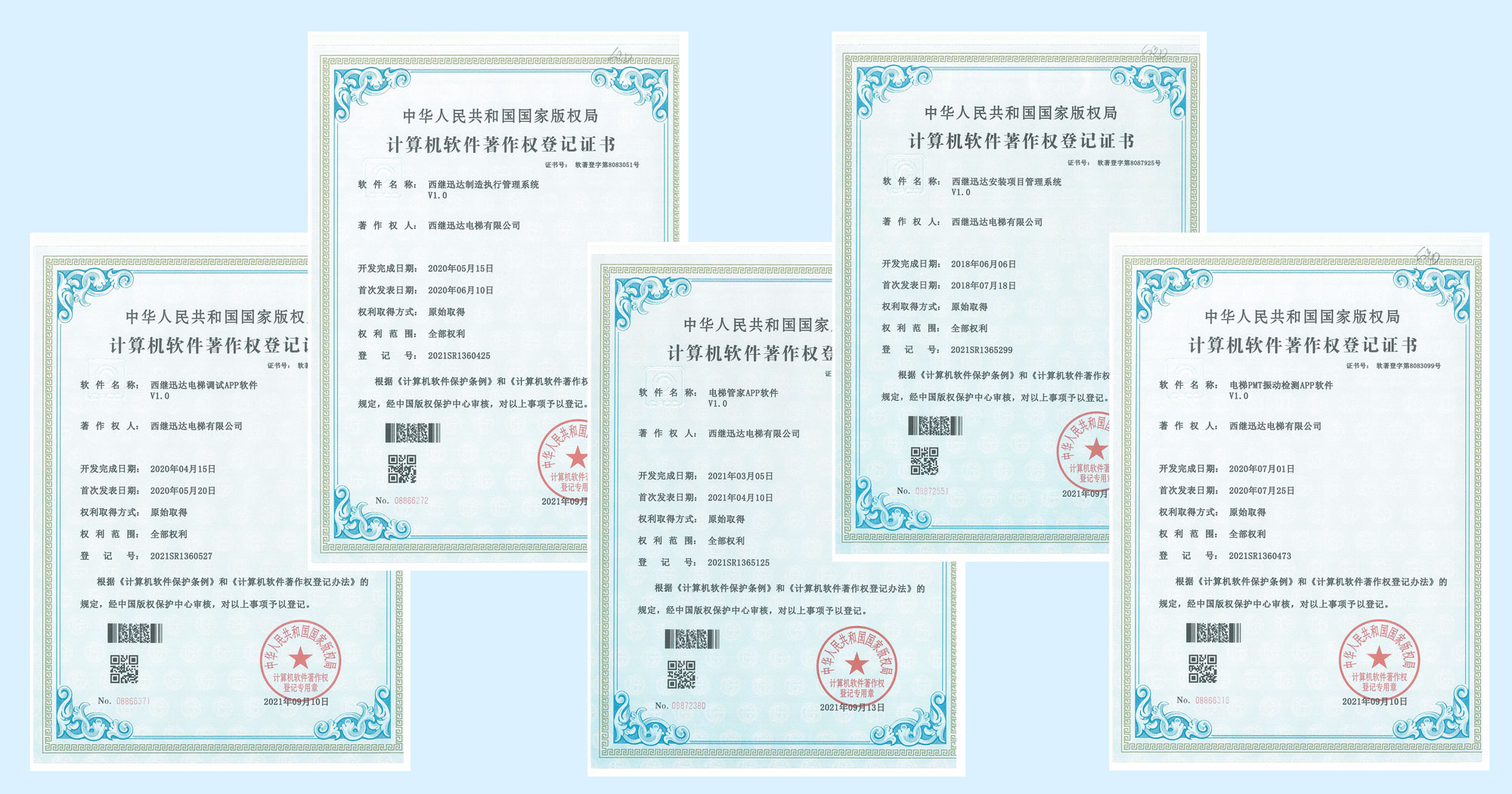9月份,國家版權局再次授權西繼迅達5項計算機軟件著作權。我公司被認定為軟件“電梯管家APP軟件”、“安裝項目管理系統(tǒng)”、“電梯調試APP軟件”、“電梯PMT振動檢測APP軟件”、“制造執(zhí)行管理系統(tǒng)”等的著作權人,并分別于9月10日、9月13日被正式授予《中華人民共和國國家版權局計算機軟件著作權登記證書》,即從證書頒發(fā)之日起,其版權得到“中國版權中心”的保護。