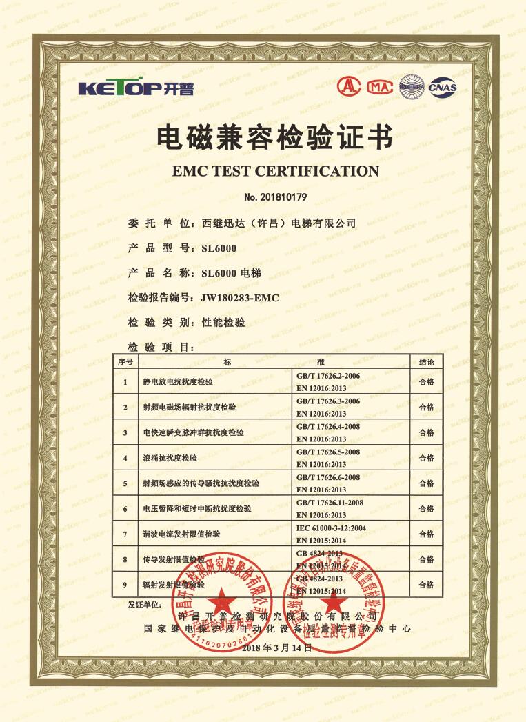3月14日,西繼迅達(dá)SL6000系列客梯、S5000系列客梯,整梯順利通過電磁兼容EMC檢測(cè),符合歐洲EN12015、EN12016標(biāo)準(zhǔn)。