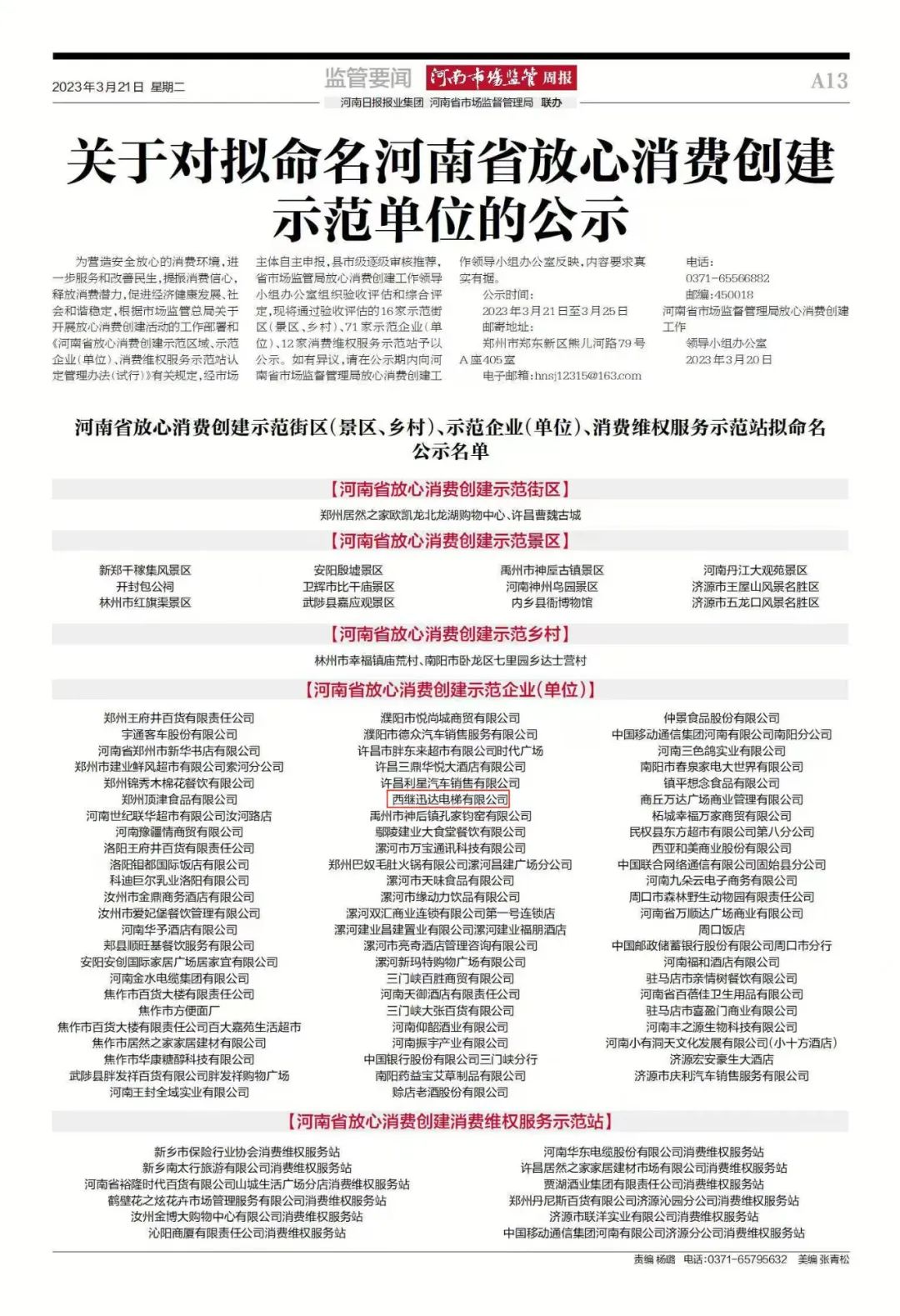 西繼迅達(dá)被評(píng)為河南省放心消費(fèi)創(chuàng)建示范企業(yè)