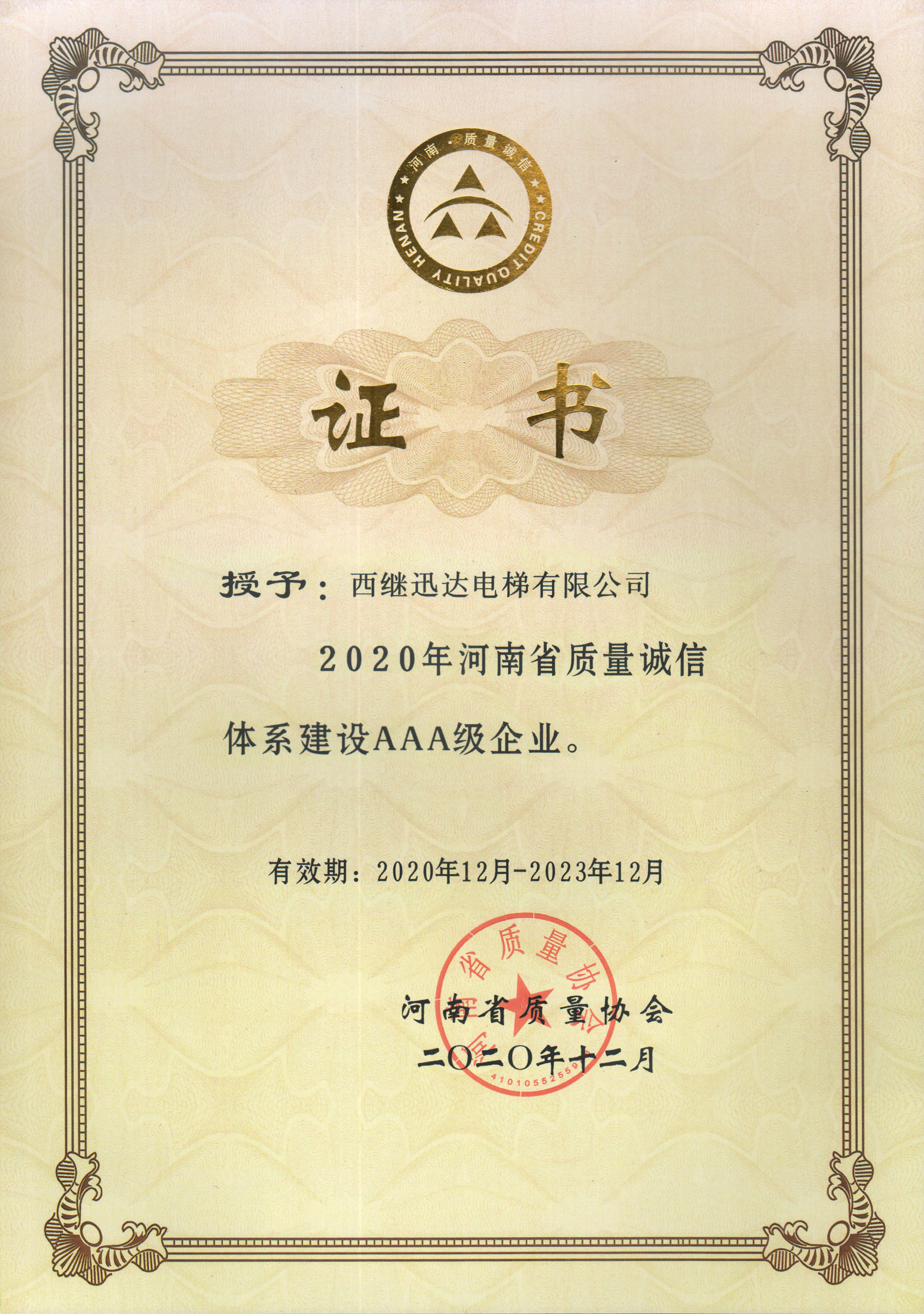 西繼迅達(dá)再次被認(rèn)定為省質(zhì)量誠信AAA級企業(yè)