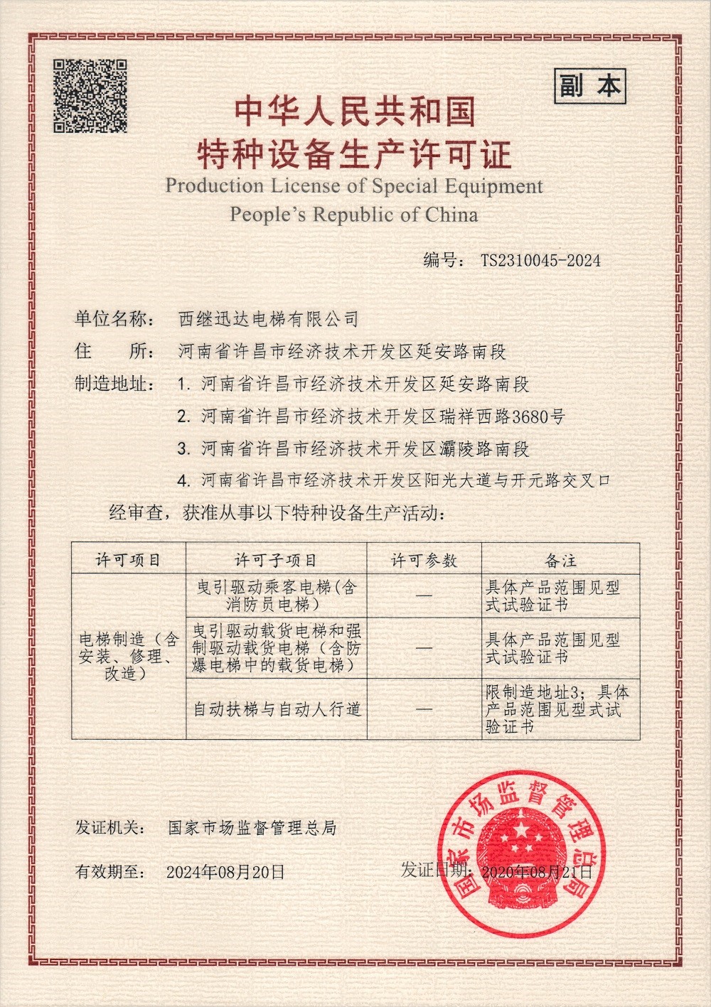 西繼迅達(dá)電梯順利完成特種設(shè)備生產(chǎn)許可證換證工作