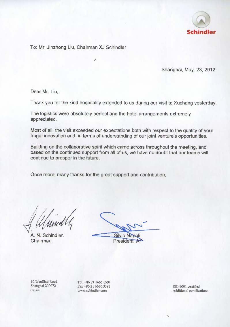 西繼迅達在電梯行業的努力得到了瑞士迅達的高度認可