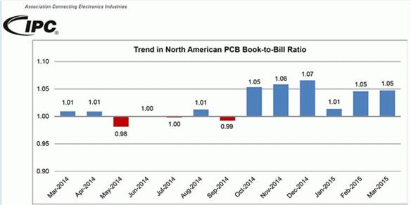 2015年4月29日,美伊利諾伊州班諾克本 — IPC — 際電子工業(yè)聯(lián)接協(xié)會(huì)發(fā)布《3月份北美地區(qū)PCB行業(yè)調(diào)研統(tǒng)計(jì)報(bào)告》。報(bào)告顯示3月份銷售雖然低迷,但是訂單量超過去年同期水平,致使訂單出貨比穩(wěn)定在1.05。