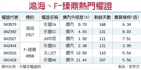 蘋果新機上市加持等利多浮現,永豐金證衍商部指出,鴻家軍中的鴻海(2317)及F-臻鼎(4958)熱門認購權證很夯。