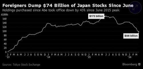 出于對安倍經濟學以及日本經濟前景的悲觀態(tài)度,彭博數據顯示,今年來交易員撤走了460億美元的資金,投資者已經連續(xù)十三周拋售日本股票,創(chuàng)1998年以來長連跌紀錄。東證指數下跌17%,這一表現之差僅次于意大利。