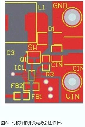 圖6是一個比較好的版圖設計。主要元件是一款與外部FET配合使用并采用MSOP-8封裝的控制器。注意CIN附近的空間,該電容的接地點直接連至二極管陽極。你無法使“電源地”內的導線更短!FET[SW]可向上移動幾毫米以縮短陰極-電感-FET之間的導線。