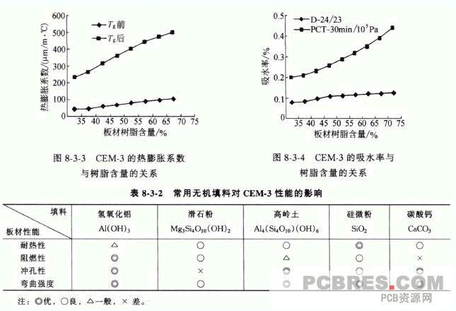 (3)無機(jī)填料無機(jī)填料是CEM-3 的重要組分之一,作為填充劑,它直接影響板材的尺寸穩(wěn)定性、通孔可靠性、耐潮濕性和機(jī)械加工性等。初的CEM-3 不含有無機(jī)填料,玻纖紙的含膠量大,使到板材有機(jī)物(環(huán)氧樹脂固化物)含量高達(dá)60% ,導(dǎo)致板材熱膨脹數(shù)和吸水率偏大,然而早期CEM-3 主要用于單面印制線路板,不需考慮通孔可靠性,耐潮濕性即使差一點(diǎn),問題也不大;隨著CEM-3 應(yīng)用范圍的擴(kuò)大,特別是在雙面印制線路板上的應(yīng)用,這些問題就暴露出來。后來,通過在芯料用膠液中加入無機(jī)填料,大大提高CEM-3的無機(jī)物比例,使板材中有機(jī)物含量和無機(jī)物含量的比例下降為40: 60 (質(zhì)量份) ,接近FR-4 水平,顯著地降低板材的熱膨脹系數(shù)和吸水率,圖8-3-3 、圖8-3-4 顯示了CEM-3 的樹脂含量(即有機(jī)物含量,通過無機(jī)填料用量來調(diào)整)與板材熱膨脹系數(shù)、吸水率的關(guān)系。CEM-3 常用的元機(jī)填料有氫氧化鋁、滑石粉、碳酸鈣、硅微粉、高嶺土等,它們對(duì)CEM-3 性能的影響見表8-3-2 。目前CEM-3 大量使用的無機(jī)填料是氫氧化鋁,氫氧化鋁含有3 個(gè)結(jié)晶水,在200 - 500 C條件下,不同程度釋放出水,在釋放水時(shí),需吸收大量的熱量,所以氫氧化鋁也是一種理想的"潔凈"阻燃劑,氫氧化鋁的粒徑越小,阻燃效果越好;但是,氫氧化鋁會(huì)影響板材的耐熱性、耐浸焊性, PCB 加工熱風(fēng)整平、元件焊接的溫度都接近氫氧化鋁的分解溫度,如果時(shí)間較長(zhǎng),高溫下氫氧化鋁受熱分解,板材會(huì)分層起泡;近年有廠家研究對(duì)氫氧化鋁進(jìn)行熱處理,脫去部分在200 多度開始分解的結(jié)晶水,可大大提高氫氧化鋁的熱分解溫度,這種含有1. 8-2.9 個(gè)結(jié)晶水的氫氧化鋁已開始供應(yīng)市場(chǎng)。