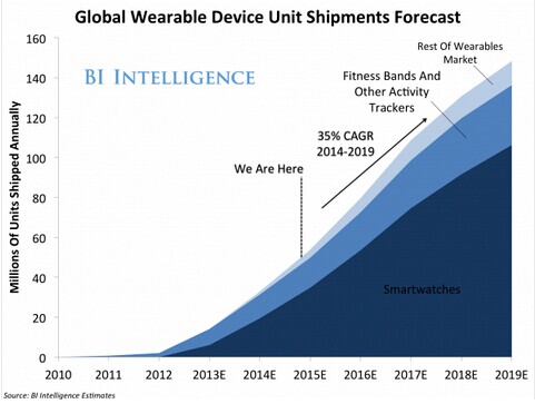 BI報告指出,穿戴設(shè)備未來幾年將迎來高增長期。預計在未來五年之內(nèi),全球穿戴設(shè)備的復合增長率將高達35%,到2019年的年銷量將達到近1.5億部。